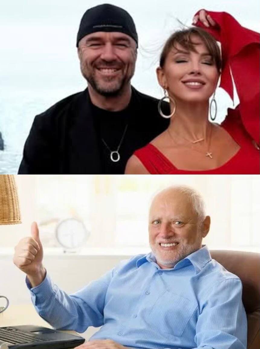 Роман Товстик на очередной романтической фотосессии с Полиной Дибровой прямо мем «Гарольд, скрывающий боль». Вот такая незавидная судьба у бизнесмена: ушел от одной жены, теперь нужно изображать счастье с другой. Он даже одежду не стал менять с прошлой фотосессии. Блокнот Старс в MAX