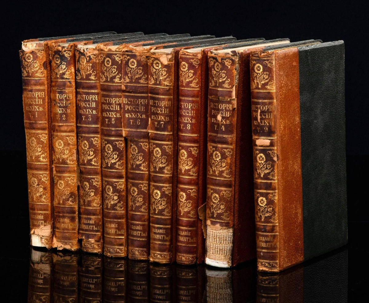 - В полумраке поблескивает только золото тисненых переплетов в тяжелых шкафах. Александр Беляев, «Голова профессора Доуэля», 1937 г.