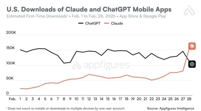 Anthropic отказался подписывать контакт с армией США. Итог на картинке - люди поддержали, а конкурент openAI подписал - итог тоже на картинке - не поддержали.