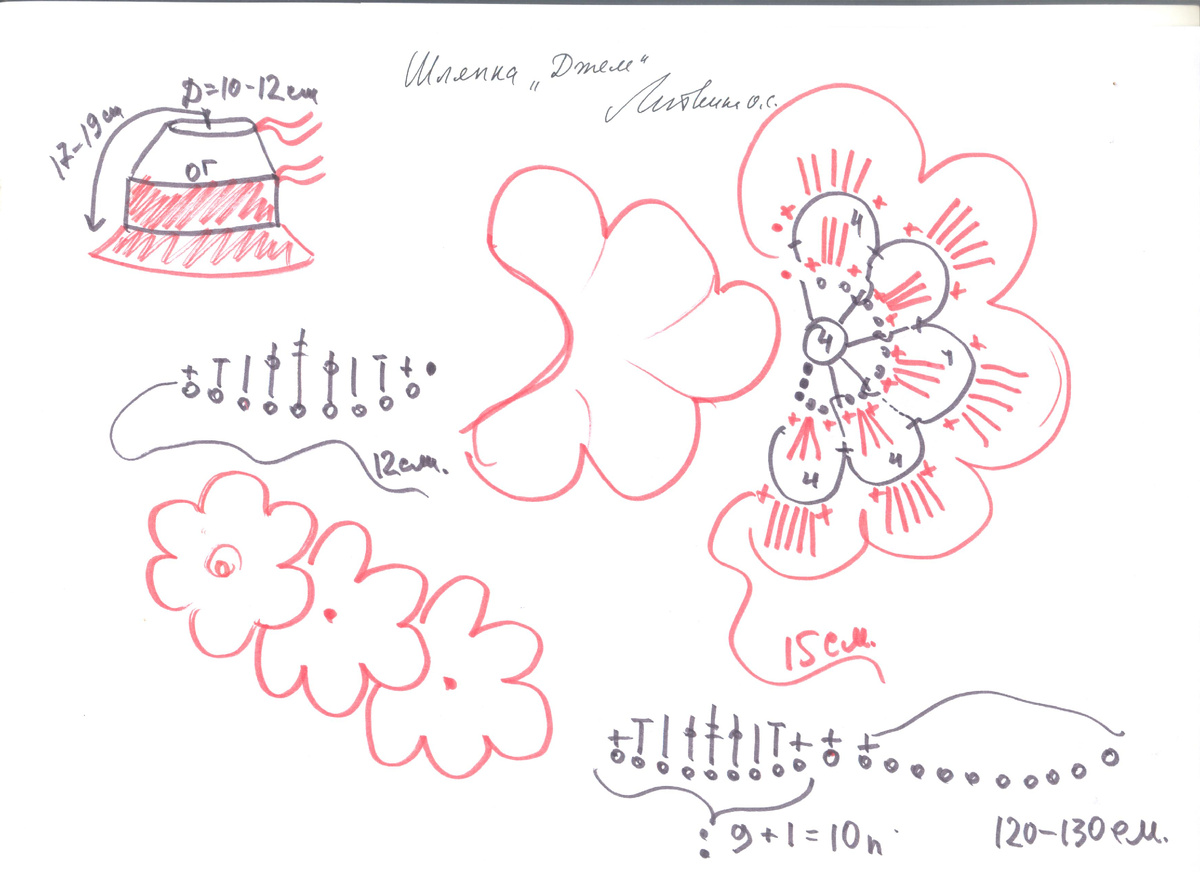 Поля шляпки являются продолжением колпачка. Первый ряд полей вяжите на ближней полупетле. Вяжите поля шляпки с прибавками в первом, третьем, пятом рядах в шести местах. Ширина полей пять - шесть рядов. Свяжите с изнанки нижние поля меланжевой нитью в одну нить крючком 4,0 мм. Делайте первый ряд на свободных полупетлях у основания колпачка. Вяжите нижние поля с теми же прибавками, что и на верхних полях. Соедините между собой верхние и нижние поля одним рядом из столбиков без накида со стороны верхних полей.