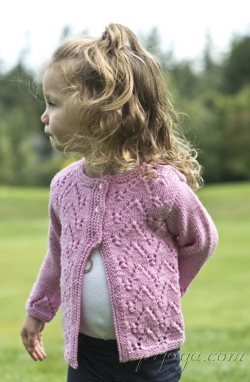 Детский жакет спицами с пуговичками у горловины.
