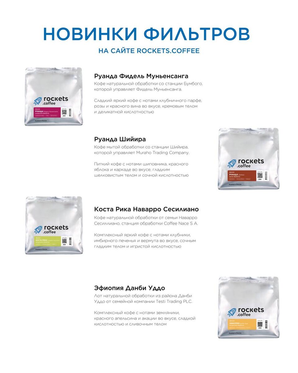 🚀 Рассказываем подробнее: КОСТА РИКА НАВАРРО СЕСИЛИАНО Комплексный яркий кофе с нотами клубники, имбирного печенья и вермута во вкусе, сочным гладким телом и игристой кислотностью РУАНДА ФИДЕЛЬ МУНЬЕНСАНГА Кофе натуральной обработки со станции Бумбого, которой управляет Фидель Муньенсанга РУАНДА ШИЙИРА Питкий кофе с нотами шиповника, красного яблока и каркаде во вкусе, гладким шелковистым телом и сочной кислотностью ЭФИОПИЯ ДАНБИ УДДО Комплексный кофе с нотами земляники, красного апельсина и акации во вкусе, сладкой кислотностью и сливочным телом Новинки уже на сайте rockets.coffee 📦