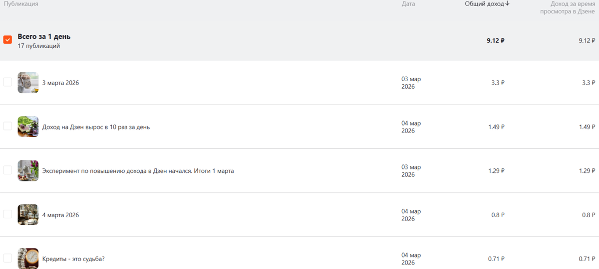 Доход от ведения данного канала продолжает расти, что не может не радовать его автора. Четвертый день подряд все больше и больше капает на счет рано утром. ) Да, выплаты, конечно, так себе, если не сказать совсем уж нецензурно, и, возможно, привлеченные заголовком, возмущенно захлопнут страницу и поместят мой канал в черный список за такие громкие заявления, но это - чистая правда! Я решила в очередной раз провести эксперимент и повысить доход от ведения канала. А началось все в этот раз так: И вот уже четвертый день подряд (с 1 по 4 марта) я наблюдаю повышение оплаты за свои опусы. И пусть она (эта оплата) курам на смех, но доход растет и это чистая правда. За 4 марта Дзен выплатил мне 9 рублей 12 копеек! И самой доходной публикацией, которая принесла мне 3 рубля 30 копеек, стала вот эта: Видите, я не только о копеечном доходе пишу, и наиболее привлекательны для читателей мои будни, хотя сейчас они более чем скучно и скромно проходят из-за болезни. Но то ли еще будет! Так что по