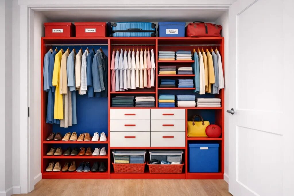 Простой способ определить будущую планировку: достаньте из шкафа всю одежду и рассортируйте на категории. Посчитайте примерное количество вешалок, стопки сложенных вещей и пары обуви. Это даст понимание, сколько штанг, полок и ящиков необходимо.