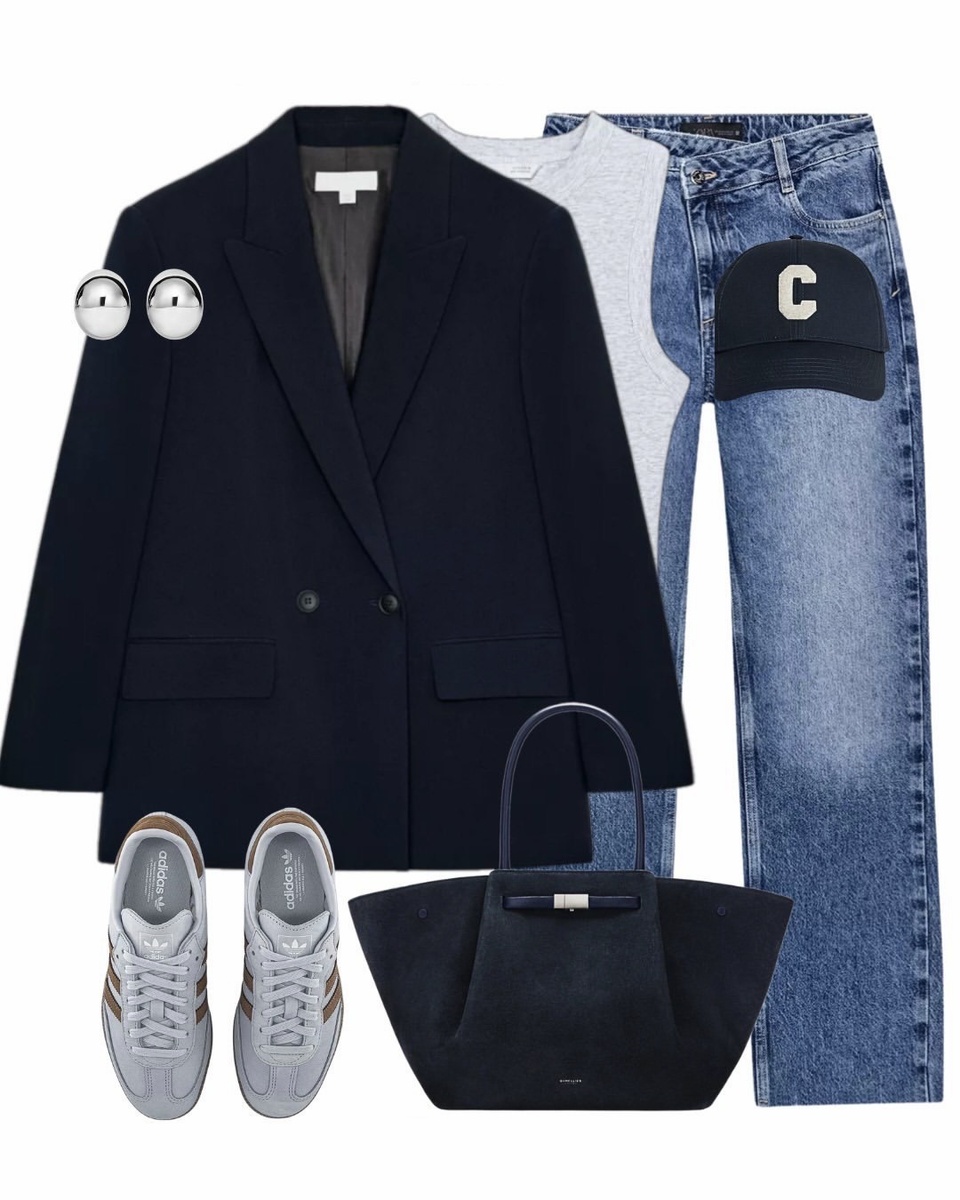 Перед нами очень удачное сочетание строгих и повседневных вещей. Темный жакет задает тон всему комплекту и собирает образ в единое целое. Светлая футболка смягчает строгость. Прямые голубые джинсы добавляют живости и делают образ по-настоящему весенним. Кепка вносит легкий спортивный акцент, кроссовки отвечают за комфорт и динамику, а вместительная сумка придает облику статусность. Даже украшения здесь не просто дополнение, а важная часть общей эстетики.