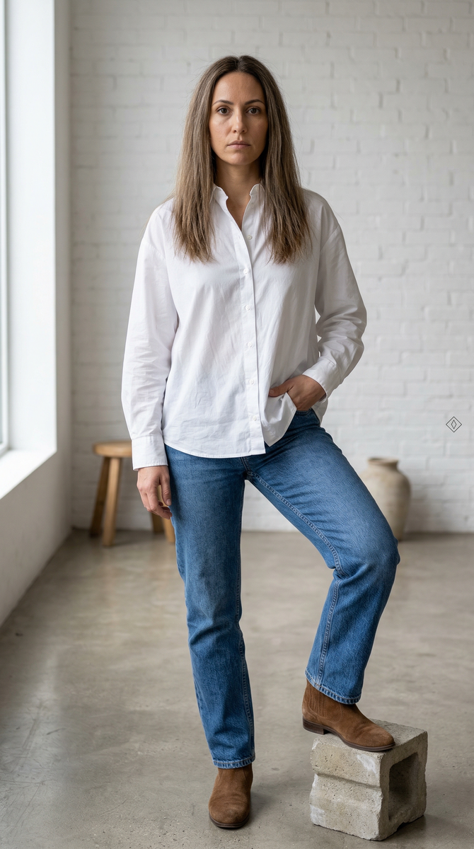 Прямая рубашка мужского кроя из плотного хлопка структурирует силуэт за счёт чётких линий плеч и вертикалей борта. Это работает как визуальная коррекция: прямые швы вытягивают фигуру, а свободный крой скрывает зоны дискомфорта без эффекта «мешка».