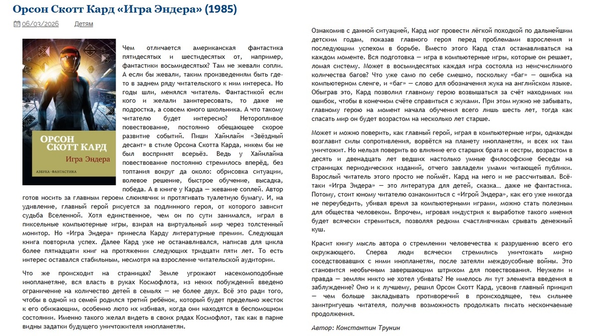Орсон Скотт Кард «Игра Эндера» (1985) | Критика