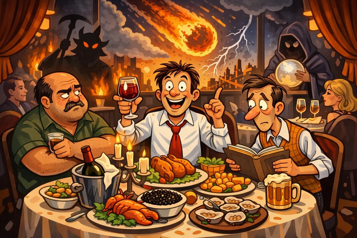 – Я позвал вас на этот прощальный ужин не потому, что смертельно болен! – торжественно заговорил Тюльпанов, глядя на тревожные лица двух приятелей. – И уж точно не потому, что решил жениться. Я пригласил вас в этот восхитительный ресторан, чтобы мы разделили последнюю трапезу, ибо грядёт Конец света! Тюльпанов сел за стол и залпом осушил бокал вина. Ресторан был дорогой, с приличной публикой и обслуживанием. Финютин и Дорогомилов – друзья Тюльпанова, которые отродясь не посещали подобных мест, сидели с растерянными физиономиями и прикидывали, во сколько обойдётся им здесь пирушка. – Да ты уже нализался, – пробасил Дорогомилов, складывая руки на округлом животе. – А я с таким трудом вырвался из дома на твой «последний ужин»! – обиделся долговязый Финютин. – Анечка не отпускала, а я ей: «Родная, пойми, это же Гриша Тюльпанов. Тот самый, что на нашей свадьбе напился как свинья и скормил собакам праздничный торт». И всё это ради шутки? – Заказывайте, друзья, не стесняйтесь, – ничуть не сму