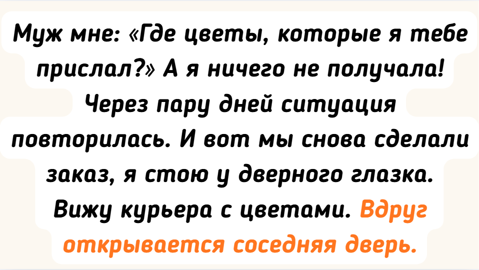 - Муж мне: «Где цветы, которые я тебе прислал?» А я ничего не получала! Через пару дней ситуация повторилась. И вот мы снова сделали заказ, я стою у дверного глазка. Вижу курьера с цветами. Вдруг открывается соседняя дверь, и из нее выходит наша соседка: «Их снова нет дома, давайте я передам цветы». Я не стала церемониться, забрала и этот букет и два предыдущих, несмотря на то, что они немного подвяли.