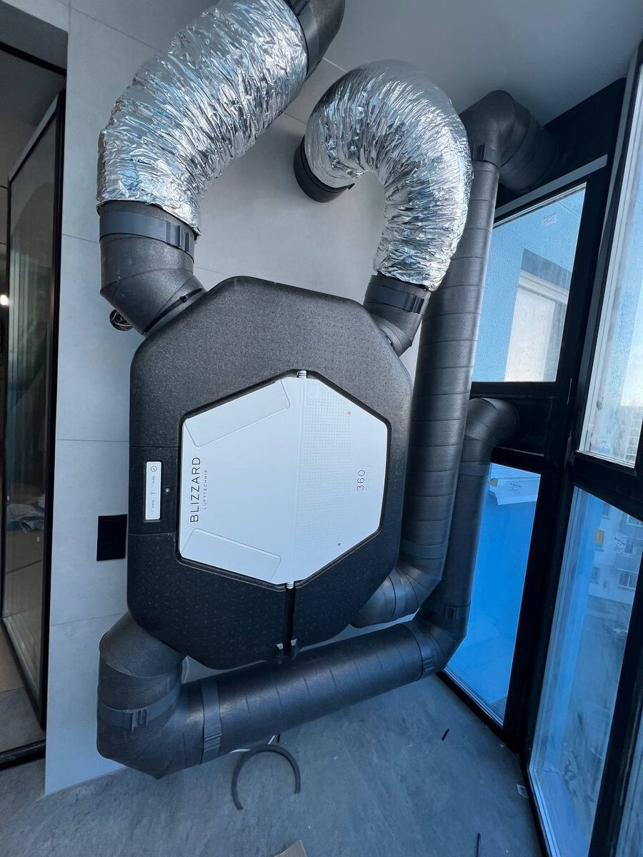 Опыт прошел успешно. Конденсат пошел! На улице минус, полет отличный. Загвоздка была в том, что у Blizzard L5 в оригинальной инструкции нет данных по возможности монтажа в приведенной позиции. На стену - пожалуйста, но горизонтально. В данном случае установка вмещалась на стену только вертикально. В рамках инструкции ПВУ можно устанавливать под потолком, на полу - в обеих случаях на кронштейны с наклоном (конденсат) в 3 градуса. На стене горизонтально - без наклона, так как в таких случаях используется нижнее подключение сифона. В вертикальном положении, как на фото - для утилизации конденсата используется нижний патрубок (черная трубка внизу ПВУ), но установка наклонена. Материал предоставлен: Инженерной компанией SILVER BOX Минск, представительство Blizzard Lufttechnik в республике Беларусь. Далее, позволим себе несколько слов о самой Blizzard L5 360. Модельный ряд второй половины 2025 года. Компактная горизонтальная установка родом из Нидерландов внутри которой уникальное "сердце",
