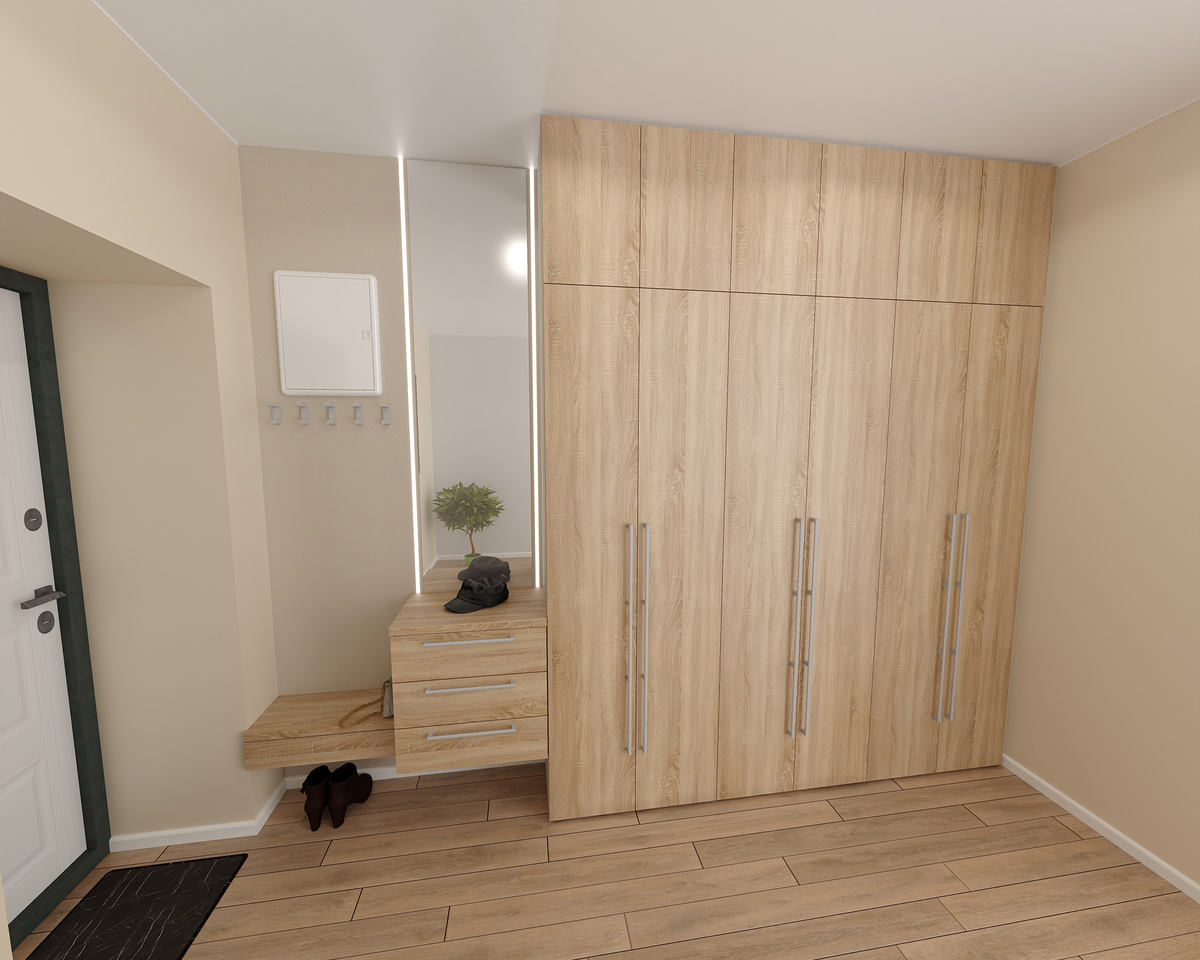 Вот такой шкаф спроектировал потенциальному клиенту. Отправил с ценой. Проблема в том, что это коридор шириной 1400мм, шкаф полноценный не сделать, штангу пришлось развернуть. Пока не придумал что сделать со щитком поинтересней, я про электричество. Панель к стене закрепим, щиток перенесем на ЛДСП, а как его закрыть, я еще не придумал. Ну если согласится заказывать, будем фантазировать. Пару недель назад обратилась клиентка, которой мы шкаф в прихожую сделали. Там рейки на стене наклеены были, декоративные из ЛДСП. Упали две рейки. Недели две не могли приехать, заменить, но недавно съездили. Ну мы так и не поняли почему они отвалились. Стена без ямок в этом месте. Клея много, на обоях блямбы остались. Просто отвалились и все. Пришлось обои надрезать под планками и заново приклеить. Другие планки все держатся крепко. Что было, мы так и не поняли. Себя запечатлели для истории. Дальше.