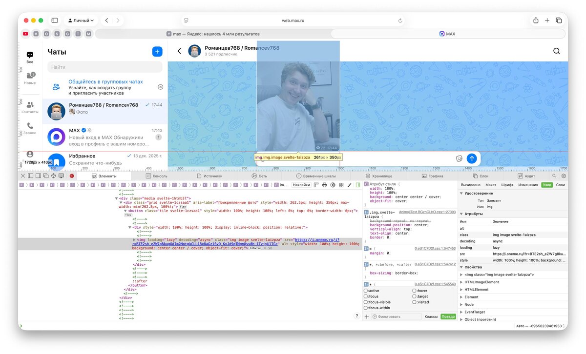 https://i.oneme.ru/i?r=BTE2sh_eZW7g8kugOdIm2NotgkCLL18x8aGz1SvQ_KvJd9qTNgmQsv0h-1TzjyUlTGc Любой у кого есть прямая ссылка может открыть картинку без входа в аккаунт. Более того, найти ссылку в коде страницы оказалось возможно за 10 секунд даже через Safari. В теории такую ссылку можно получить перебором символов, чем занимаются алгоритмы. Но это в теории. Сложно представить что так получится найти изображение из личной переписки. Думаю дыру закроют лихо.