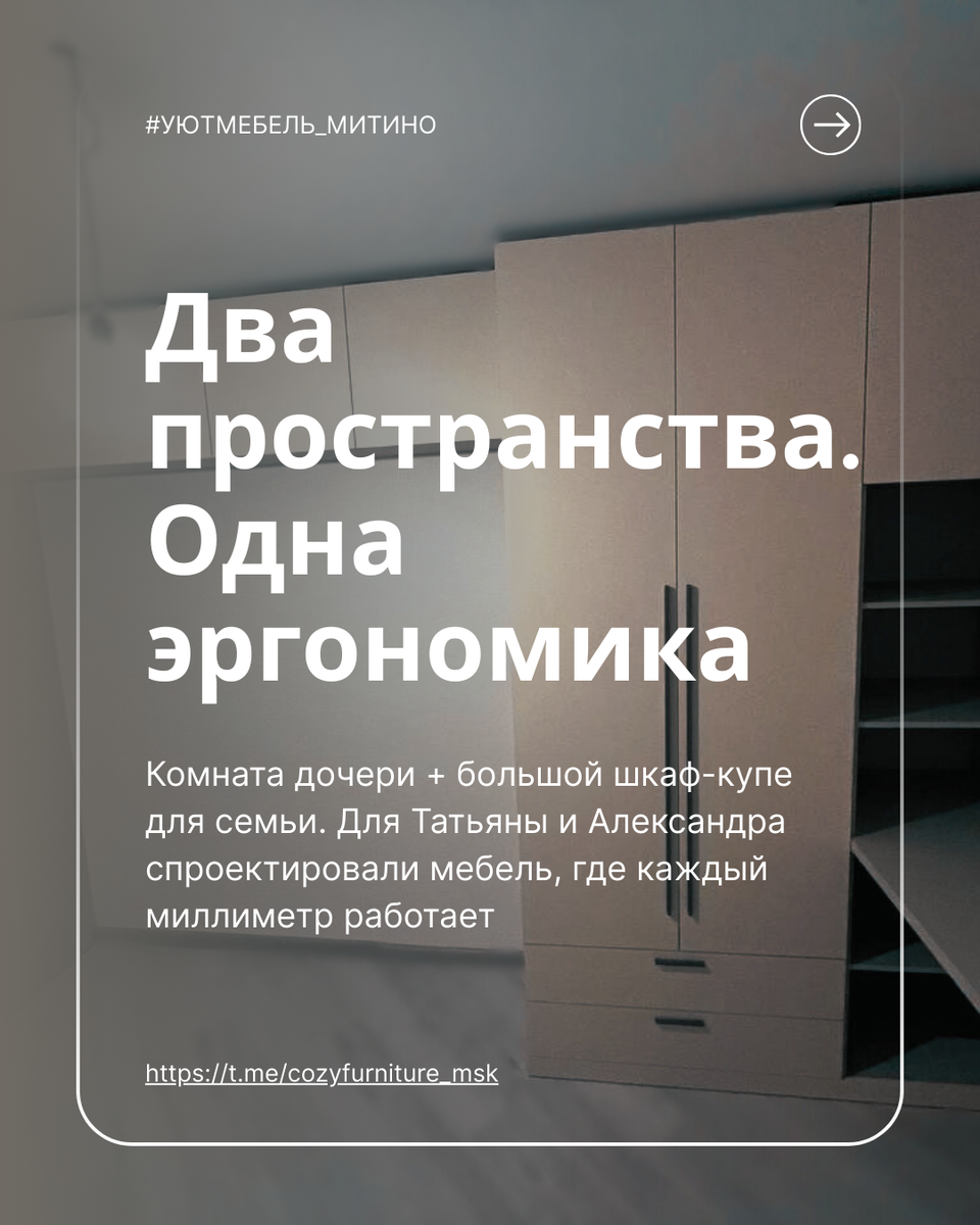 Эргономика двух пространств — рассказываем о материалах, фурнитуре и инженерных решениях Когда в доме есть дочь-подросток, её комната должна быть одновременно местом для учёбы, системой хранения и личным пространством. А в большой комнате нужен вместительный шкаф, который организует хранение всей семьи. К нам обратились Татьяна и Александр с задачей: организовать оба помещения так, чтобы каждое решало свои задачи, но при этом интерьер оставался цельным и эстетичным. Рассказываем, как мы это сделали. Главная сложность проекта — разная функциональность комнат. В комнате дочери нужно было совместить рабочее место, гардероб и хранение личных вещей. В большой комнате — вместить огромный объём одежды и аксессуаров всей семьи, не загромождая пространство. Мы предложили решение в единой стилистике, но с разными инженерными акцентами. Здесь мы объединили две зоны в едином стиле, используя одинаковые материалы для создания цельного образа. Те же материалы: корпус ярко-серый, фасады бежевые. Для