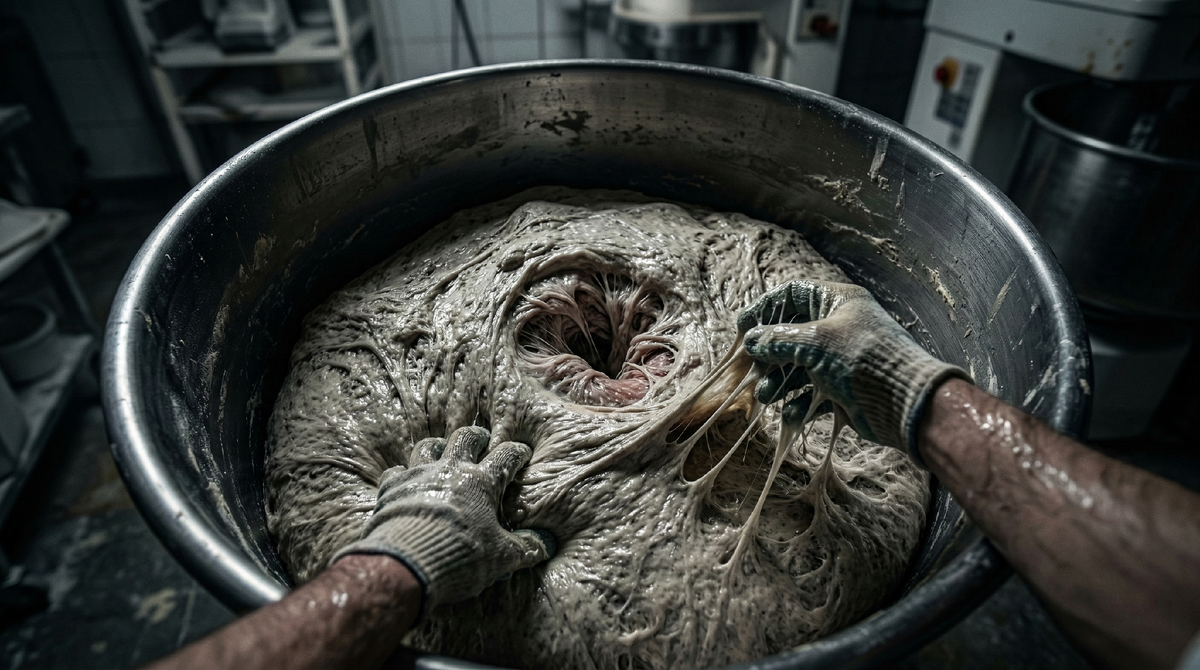 Жара в пекарне всегда висит плотным, тяжелым слоем под потолком. К двум часам ночи мучная пыль забивается в нос так, что перестаешь чувствовать запахи. Вокруг только гул промышленных тестомесов и лязг металлических противней. Я стоял у фасовочного стола, когда боковым зрением уловил движение в углу цеха. Там стояла дежа — огромный стальной чан на двести литров, в котором подходила опара для утренней партии пшеничного. Чан был накрыт плотной пленкой, чтобы тесто не заветривалось. Оно не просто поднималось. Оно дышало. Пленка натягивалась рывками. Вверх, пауза, медленное оседание вниз. Цикл занимал секунды три. Как будто на дне стального чана лежал взрослый человек с тяжелой одышкой и с трудом набирал воздух в легкие. Я вытер руки о фартук. Тесто дрожжевое, оно живое, это любой пекарь знает. Оно пузырится, шевелится, издает тихие звуки, когда углекислый газ выходит. Но у этого процесса нет ритма. А тут пленка пульсировала так четко, что я невольно начал дышать с ней в такт. Подошел ближе
