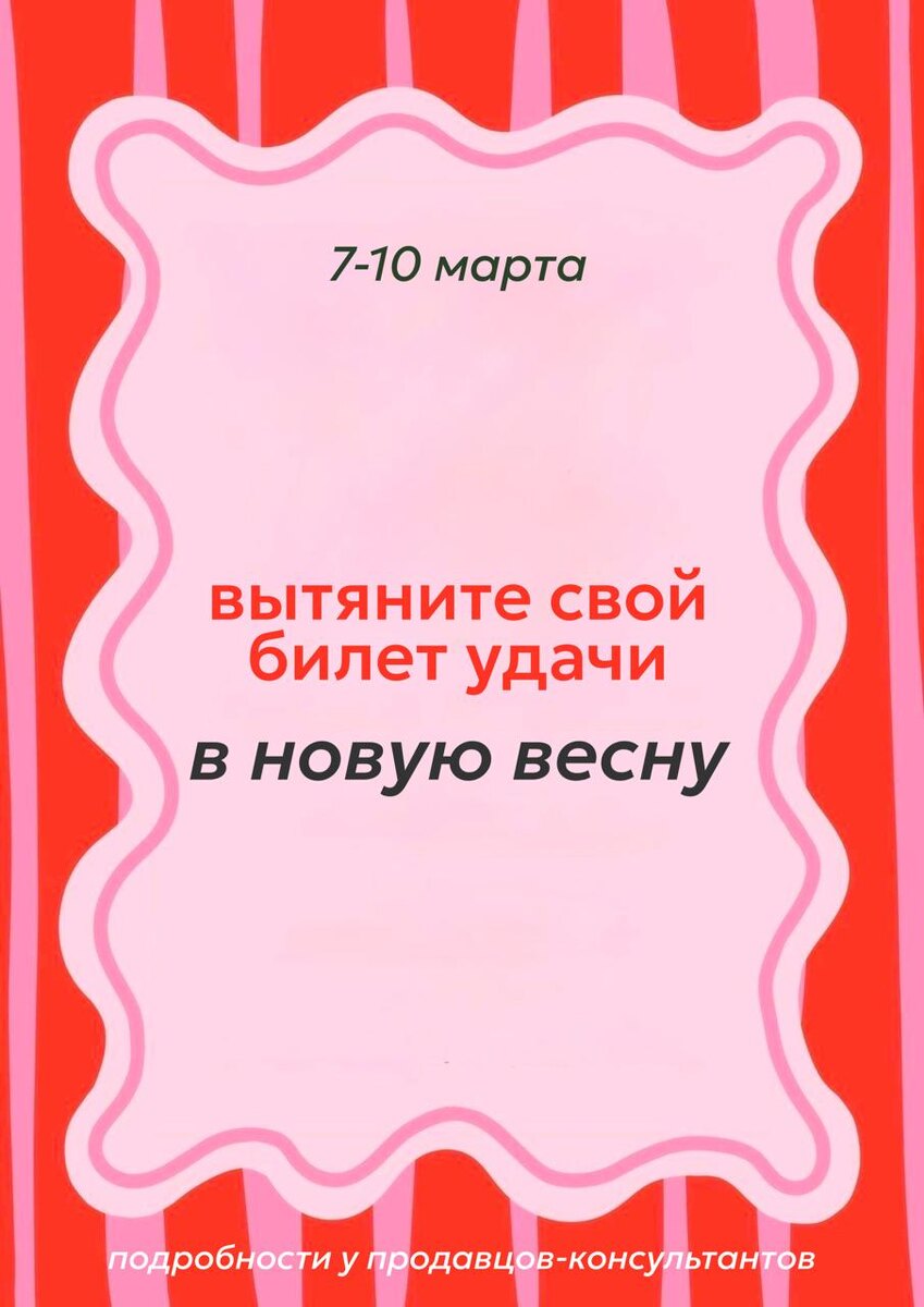 В честь 8 марта БОТИК 35 подготовил подарки для каждой. С 7 по 10 марта, совершая любую покупку, вы сможете вытянуть шар с подарком — внутри подарки от БОТИК 35 🎁 А заодно можно открыть для себя новую весеннюю коллекцию, которая уже появилась в магазинах и на сайте 🌷 Ждём вас: ТЦ Эльгрин, 3 этаж, с 10:00 до 21:00 ТЦ Петровский, 1 корпус, 1 этаж, с 10:00 до 21:00 botik35.ru *забронировать пару обуви на примерку через менеджера @botik35tg