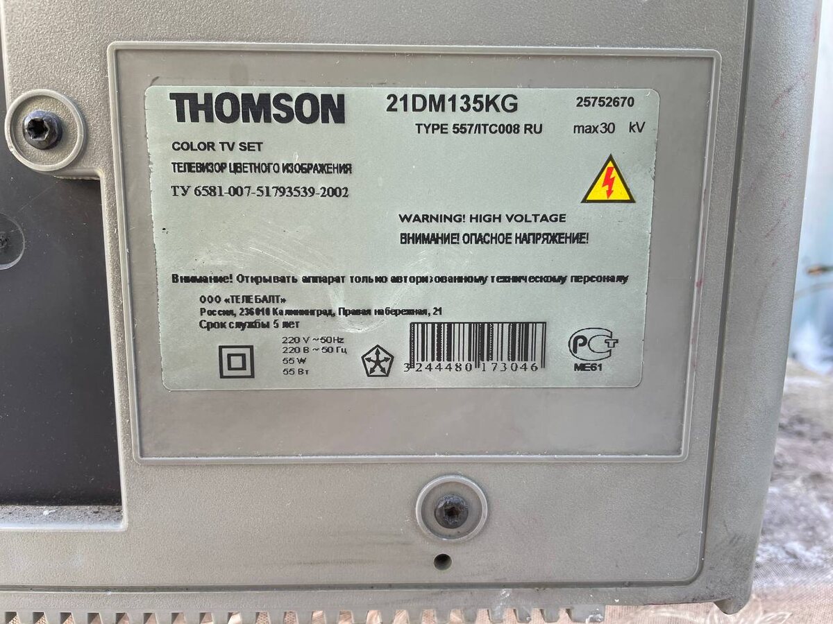 Люблю, когда открываешь заднюю крышку телевизора и удивляешься, словно впервые видишь, что у него внутри. Хотя все и очевидно, временами вспыхивают удивительные чувства. В этой статье я расскажу, как получил данный телевизор, разберу его и покажу что интересного есть внутри. Однажды, в начале декабря, я как обычно «рыбачил» на Авито. Было утро, я ждал утренней планерки на работе и скучал, переходя от одного объявления к другому. Внезапно, мой взгляд упал на ничем не примечательное фото. Там был совершенно некрасивый, весь в засаленных пятнах телевизор Thomson 21DM135KG. За него просили 500 рублей. Я предложил 150, сомневаясь, что согласятся. К моему удивлению, продавец согласился сразу. Вечером того же дня я взял жену с собой в охапку и направился по нужному адресу. На месте меня ждали продавец, его жена и кот (большой, жирненький и пушистый). Квартира похоже была куплена недавно, везде были видны следы ремонта и много старых (и похоже не нужных) вещей от прошлых хозяев. Телевизор хоть