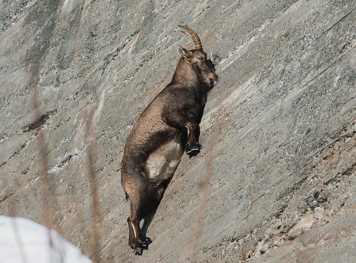 Горный козёл на практически отвесной скале – обычный элемент пейзажа во многих странах. Люди едут мимо в своих автомобилях, фермеры спешат по своим делам пешком, и никто не обращает никакого внимания: обычный день, обычный козёл, всё путём. Но даже те, кто живут с этими невероятными зверями бок о бок, не всегда знают о том, зачем, а главное, как козлам удаётся бежать «по стене» и не падать. Пожалуй, стоит для начала сказать вот что: козлы всё-таки периодически падают. Ну нет в них никакой магии, и в природе всё сурово: упал – значит не прошёл отбор. Но мы-то с вами хотим поговорить о тех, кто удержался, и разобраться в том, что за замечательные адаптации ему в этом помогли. Или ей. Козы-мамочки даже ухитряются на крутых склонах беззаботно кормить своих козьих детишек молоком. На совершенно гладкой стене никому не удержаться, но если на ней есть хоть малейшие, толком незаметные для нас с вами, выступы, то всё – стена козлу по плечу. То есть по копыту. Копыта у горных козлов способны шир