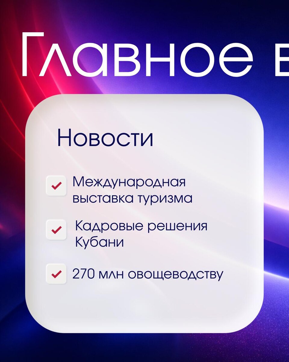 🤩Молодые предприниматели могут получить грант 500 тыс. рублей на цифровой стартап в конкурсе «Создай НАШЕ» — заявки принимают до 10 марта 🤩Курорты Краснодарского края представят туристический потенциал региона на международной выставке MITT в Москве с 11 по 13 марта 🤩В Краснодаре запустили программу «СВОй бизнес» для обучения участников СВО и их семей предпринимательству 🤩Юлия Приходько назначена руководителем департамента развития бизнеса и ВЭД Краснодарского края 🤩В Краснодарском крае в 2026 году направят около 270 млн рублей на поддержку овощеводства 🤩На Кубани создадут постоянно действующую рабочую группу для мониторинга влияния налоговых изменений на бизнес 📱 мы в MAX 🤩Агентство по привлечению инвестиций Краснодарского края