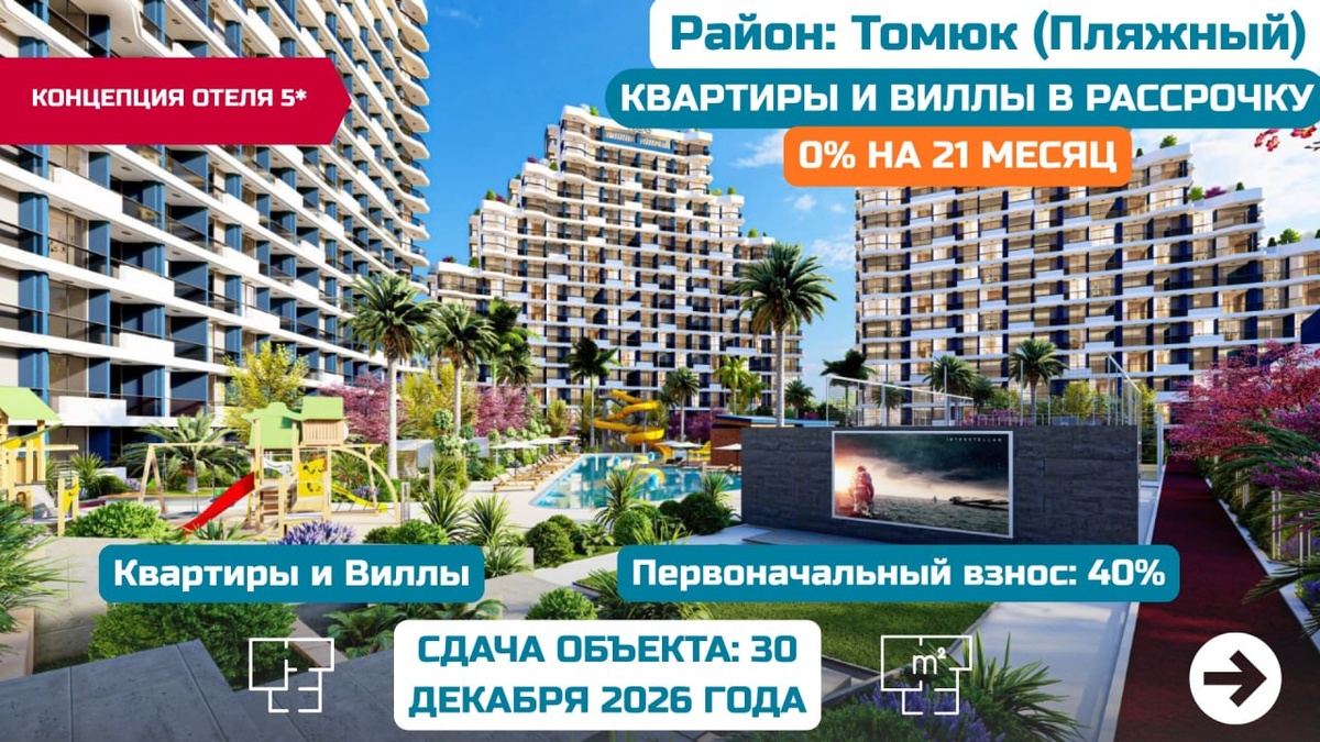 🔥 🏨 КОНЦЕПЦИЯ ОТЕЛЯ 5* 🇹🇷 РАЙОН ОТКРЫТ ДЛЯ ВНЖ ⏳ СДАЧА ОБЪЕКТА: 30 ДЕКАБРЯ 2026 ГОДА 📍 Основные параметры: ▪️ Район: Томюк (Пляжный) ▪️ Квартиры: 1+1 (60 м², терраса 6 м²) и 2+1 (100 м², терраса 8,5 м²) ▪️ Виллы: 3+1 (179 м² с собственным бассейном) ▪️ Отопление: система природного газа (трубы проведены) ▪️ Состояние: сдача с качественным евро-ремонтом под ключ 💰 Условия оплаты: — Первоначальный взнос: 40% — Рассрочка: 0% на 21 месяц (без переплат) ✨ В стоимость включено (Евро-ремонт): — Кухонный гарнитур с гранитной столешницей — Оборудованные санузлы (шкафчики, сантехника 1-го класса) — Вестьер (встроенный шкаф в прихожей) — Напольное покрытие: паркет 10 мм — Качественные окна ПВХ ✅ Супер-инфраструктура (Premium 5*): — Огромные бассейны (850 м²) и Аквапарки 🤽♂️ — SPA: Сауна и Хамам 🧖♂️🧖♀️ — Развлечения: Кинотеатр 🎬, зоны PlayStation и Бильярд 🎱 — Спорт: Фитнес-зал 🏋️♂️, Теннисные корты 🎾, Футбольное поле ⚽️, Баскетбольная площадка 🏀 — Коммерция и сервис: Конфере