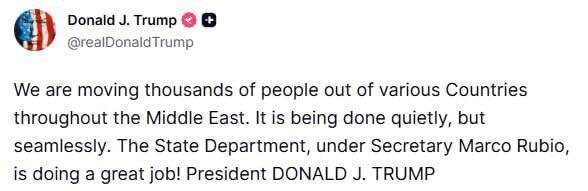 Թրամփը «Պետդեպարտամենտը, պետքարտուղար Մարկո Ռուբիոյի ղեկավարությամբ, հիանալի աշխատանք է կատարում»,- գրել է ԱՄՆ նախագահը։