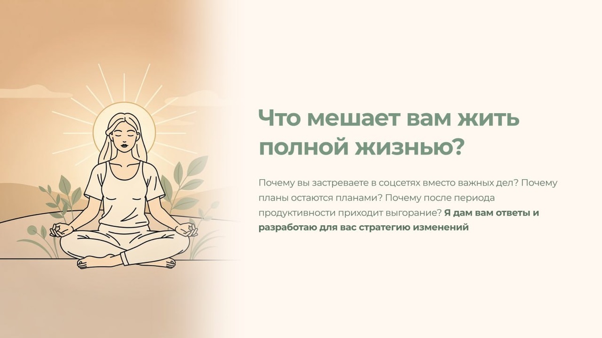 ? Почему я много времени провожу в соц.сетях, когда у меня горят важные дела по всем фронтам? Почему я планирую поменять свою жизнь, но так и не дохожу до действий? Почему после периода отличной продуктивности меня выкидывает в длительное выгорание? Почему тело постоянно болит, мозг плохо соображает, а внутренний критик бесконечно атакует? Я помогаю ответить на эти вопросы и создаю стратегию изменений на ближайшие 1-3 месяца только для вас в индивидуальном порядке! Ведь мы все уникальны, и наши истории, и наше состояние..и работа нашей нервной системы. 📍 Пакет сессий «🔠🔠🔠🔠🔠🔠🔠🔠🔠 изменений» - ваш первый шаг к осознанной и наполненной жизни без бесконечного стресса и выгорания Что вы получите в рамках пакета «Стратегия изменений»? 1️⃣ Глубокое понимание вашего текущего состояния на всех уровнях (мозг, тело, психика) За пару дней до нашей первой встречи я отправлю вам онлайн-тесты (займут всего 10–15 минут). Они покажут, как работает ваш мозг, какие стратегии поведения