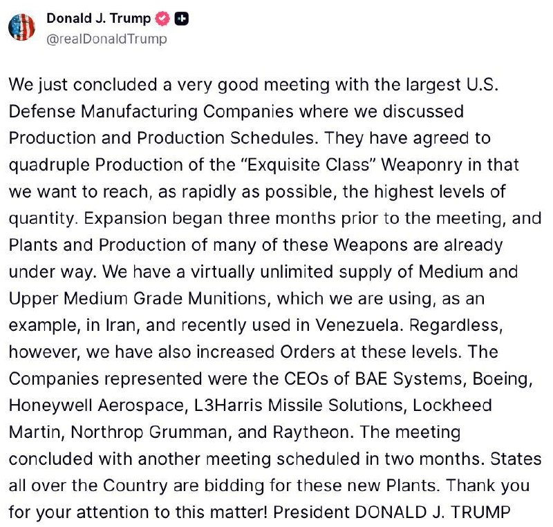 ‘We just concluded a very good meeting with the largest US DEFENSE MANUFACTURING COMPANIES’ — Trump