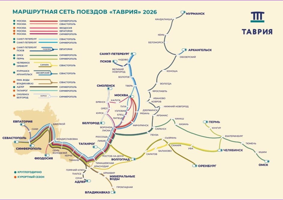 Этим летом к морю отправятся 20 поездов «Таврия» - 11 круглогодичных и 9 сезонных. Купить билеты на 1 июня можно уже сегодня. Но есть кое-что важное, что стоит знать заранее. Билеты поступают в продажу за 90 дней до отправления, а стоимость формируется по принципу динамического ценообразования: чем ближе дата и выше спрос - тем дороже. Летом, в пик сезона, билеты разлетаются быстро. В этом году география маршрутов значительно расширена: в расписание включены вагоны из Владикавказа, Архангельска, Пскова и Белгорода. Абсолютной новинкой стал маршрут из Оренбурга. Флагманский «Таврия Экспресс» отправляется с Казанского вокзала Москвы в 08:40 и преодолевает почти 2000 км до Симферополя за 27 часов 25 минут - делая 13 остановок по пути. Поезд - это не просто способ добраться. Это уже начало отпуска: виды за окном, уютное купе и то самое предвкушение моря, которое невозможно почувствовать в самолёте. Бронируйте сейчас - летом дешевле не будет 🚂 Больше интересного о Крыме в нашем телеграм-ка