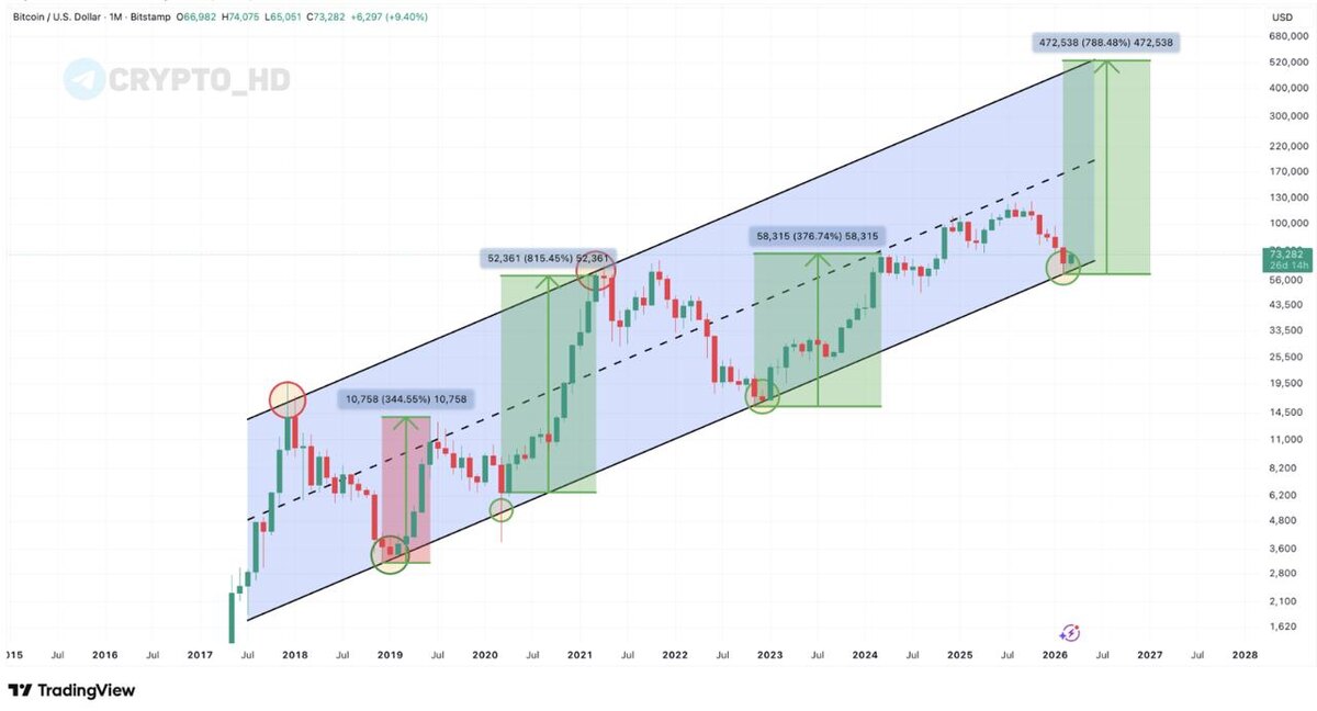 📈 Один из популярных графиков в Twitter с потенциальным ростом Биткоина до ~$500,000. BTC тестирует многолетнюю линию тренда, которая указывает на ДНО Биткоина на месячном таймфрейме. Crypto Headlines