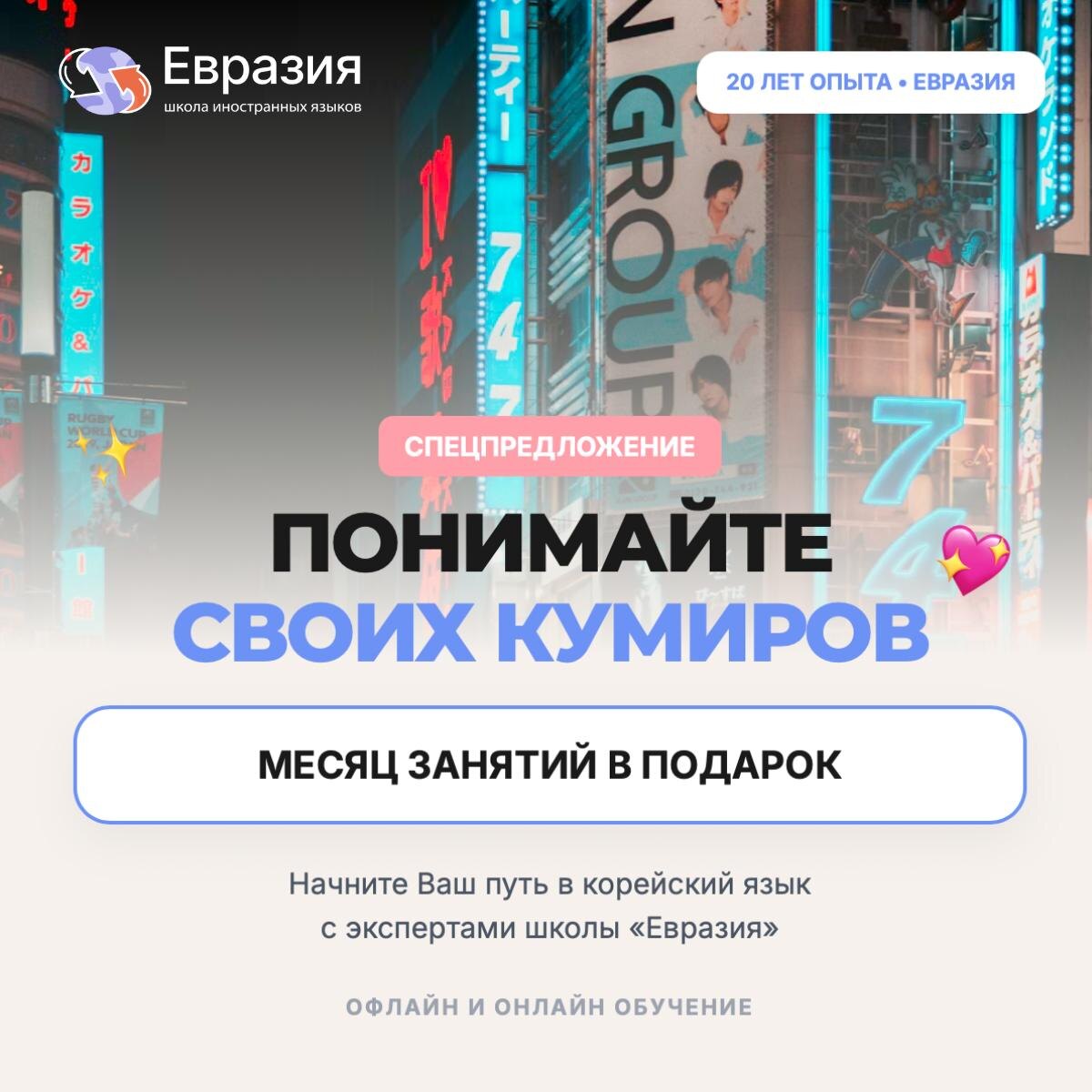 💌 В школе иностранных языков «Евразия» корейский выстроен как система, а не набор случайных уроков. ✨ Формат ×2: русскоязычный преподаватель + носитель — понимаешь логику языка и сразу слышишь живую речь ✨ 20 лет методики — без хаоса, бесконечных конспектов и ощущения, что ты «не тянешь» ✨ Преподаватели из Кореи — язык, который работает в реальности, а не только в классе ✨ Интерактивная платформа — держит в рутине и показывает прогресс, даже когда мотивация скачет ✨ Обучение под конкретную цель — TOPIK, переезд, учёба, работа, путешествия, дорамы без субтитров 🎁 +1 месяц индивидуальных занятий бесплатно Берёшь пакет занятий до 15 марта — получаешь ещё 4 недели уроков без доплат. 📩 Пиши МАРТ 👉 @Eurasia_online_help_bot И начинай корейский без переплат и разочарований ✨