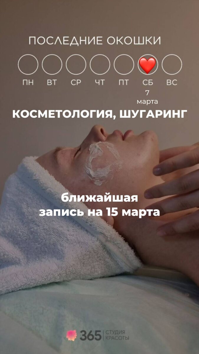 🌷 Завтра долгожданные выходные, а впереди - замечательный весенний праздник 8 марта 🌷🌷 Это время, когда хочется порадовать себя и любимых особой атмосферой внимания и искренних пожеланий 🙏🏻 #красота #наслаждение #забота #весна #любовь #мечты сбываются #радость #возможности ЧТО МОЖНО УСПЕТЬ СДЕЛАТЬ 07 марта 2026 года : Ногтевой зал: 11:00 14:30 16:30 19:30 Сет в 4 руки: 14:30 Парикмахерский зал: 17:00 20:30 Оформление бровей и ресниц: ближайшая запись на 11 марта Косметология/шугаринг: ближайшая запись на 15 марта ЗАПИСАТЬСЯ МОЖНО ЛЮБЫМ УДОБНЫМ СПОСОБОМ: 👉🏻 Сообщение в Whats'app https://wa.me/79663654477 👉🏻По телефону +79663654477 👉🏻Онлайн запись https://n286444.yclients.com/ #команда365 #красота #наслаждение #забота #весна #март #любовь #мечтысбываются #радость #возможность