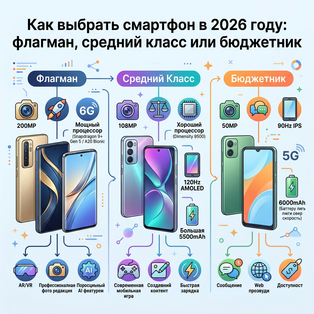 Хороший смартфон — не самый дорогой, а тот, который подходит именно под ваши задачи. Для большинства оптимален средний класс за 25 000–45 000 рублей: он закрывает все ежедневные потребности, прослужит 4–5 лет и не ударит по бюджету. Флагман оправдан, если телефон — ваш основной рабочий инструмент. Бюджетник — если нужен запасной или подарок пожилому родственнику. Напишите в комментариях, каким телефоном пользуетесь и довольны ли выбором!