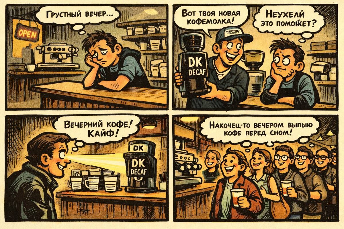 В большинстве кофеен Decaf присутствует «для галочки». Он есть в меню, но продаётся редко. Часто это несколько чашек в неделю. Но если посмотреть на кофейни Европы, картина другая. Там Decaf становится полноценной частью кофейного меню, а в некоторых заведениях на него приходится 10–15% всех напитков. Почему так происходит? Дело не только в самом кофе. Дело в правильной системе работы с Decaf. Почему Decaf становится трендом За последние годы качество Decaf сильно выросло. Современные методы декофеинизации: • Swiss Water • Sugar Cane • Mountain Water позволяют сохранить чистый вкус кофе. Decaf больше не воспринимается как «плохой кофе». Это просто кофе без кофеина. Кому нужен Decaf На самом деле аудитория Decaf гораздо шире, чем кажется. Это: • гости, чувствительные к кофеину • беременные • люди, которые ограничивают кофеин • гости, которые уже выпили несколько чашек • гости, которые хотят кофе вечером И именно последний сценарий становится самым важным. Европейская идея