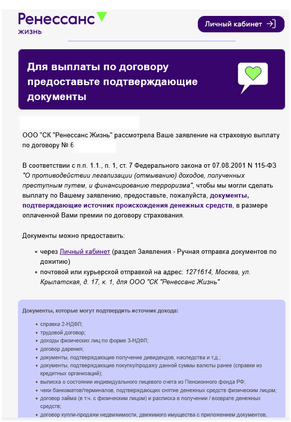 Ренессанс жизнь затребовал подтверждение происхождения денег при закрытии НСЖ Сижу жду деньги после закрытия "Накопи и точка", а они не приходят. Уже переживать стал и тут пришло смс, а потом и письмо в почту с просьбой предоставить подтверждение происхождения денег. Ну, не наглость ли? В соответствии с п.п. 1.1., п. 1, ст. 7 Федерального закона от 07.08.2001 N 115-ФЗ "О противодействии легализации (отмыванию) доходов, полученных преступным путем, и финансированию терроризма", чтобы мы могли сделать выплату по Вашему заявлению, предоставьте, пожалуйста, документы, подтверждающие источник происхождения денежных средств, в размере оплаченной Вами премии по договору страхования. 🔸 через Личный кабинет (раздел Заявления - Ручная отправка документов по дожитию) 🔸 почтовой или курьерской отправкой на адрес: 1271614, Москва, ул. Крылатская, д. 17, к. 1, для ООО "СК "Ренессанс Жизнь" 🔸 справка 2-НДФЛ; 🔸 трудовой договор; 🔸 доходы физических лиц по форме 3-НДФЛ; 🔸 договор дарения; ?