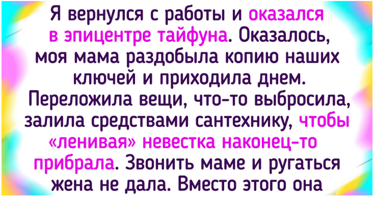 - Моя жена иногда бывает совсем «отбитой», но в остальное время она просто идеальная женщина для меня. Я, когда только женился, предупреждал маму умерить свой пыл: она любит контролировать все, до чего дотянется. Однажды я вернулся с работы и оказался в эпицентре тайфуна. Оказалось, моя мама раздобыла копию наших ключей и приходила днем. Переложила вещи, что-то выбросила, залила средствами сантехнику, чтобы «ленивая» невестка наконец-то прибрала. Звонить маме и ругаться жена не дала. Вместо этого она отжала у меня запасной ключ от родительской квартиры и на следующий день вместо работы пошла туда. Не знаю, что за порядки она там навела, но вечером звонила мать в истерике, которую пытался успокоить хохочущий отец.