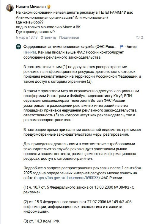 Пользователи ВКонтакте оставляют недовольные комментарии в группе Федеральной антимонопольной службы с вопросами о рекламе в Телеграм. Всем отвечают заготовленным текстом про то что, реклама запрещена потому что доступ к Телеграм ограничен. 🙄 Некоторые из вопросов: официального запрета или блокировки Телеграмма пока что не было. Как это было в случае с организацией Meta*. Поэтому не нужно нервировать население ещё больше и мешать людям работать. То, что вам невыгодно работать с какими-то платформами - не должно касаться всех граждан. дайвайте просяним, что значит ограничена? Искуственное вне судебное ограничение РКН? Вас самих не смущает. А на каких налоги вы собрались жить? Вы искуственно ограничиваете бизнес, особенно в международной работе. Бизнес не дополучить денег, не заплатить налоги, сократить персонал и закроется. Поиск по Универсальному сервису заблокированных сайтов показывает — телеграм не заблокирован. На основании чего вы пишете о запретах? * Признано экстремистским и