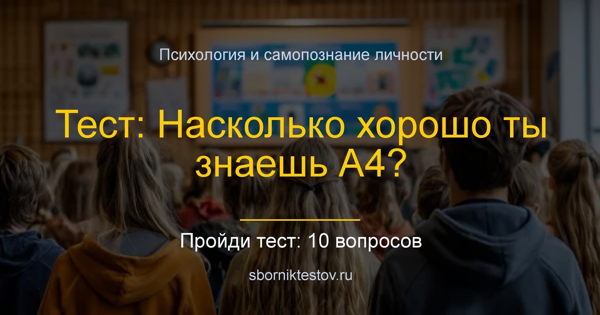 ? Этот тест проверит твои знания о популярном блогере Владе Бумаге, его команде, самых известных челленджах, памятных моментах канала. Узнаешь, насколько глубоко ты погружен в мир А4: от первых видео до последних трендов, от участников команды до культовых фраз. Тест покажет твой уровень фанатизма,... 10 вопросов · Тест личности Уже прошли: 12 939 человек ▶️ Пройти здесь в Телеграм 🌐 Пройти на сайте