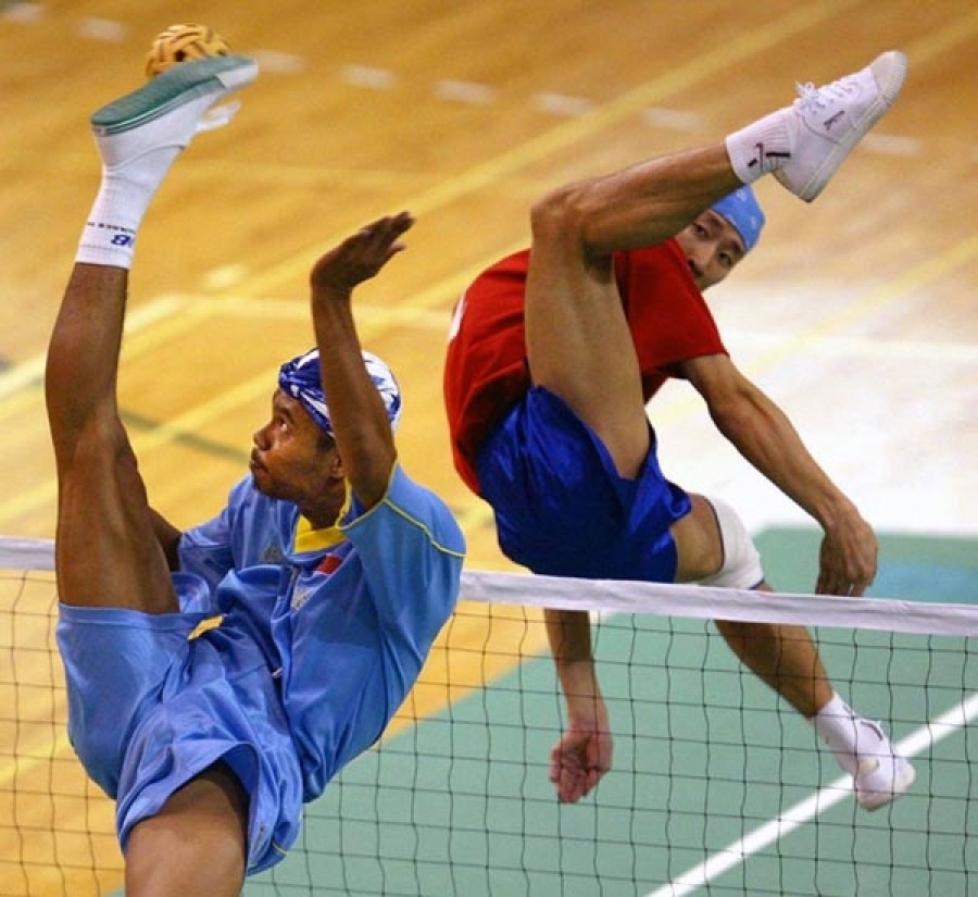 Игра называется Сепактаркау также малайский волейбол.