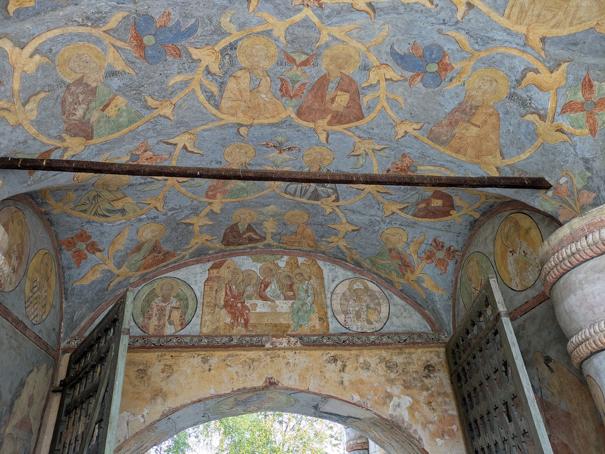 Внутрь церкови не попала, старинного деревянного иконостаса не видела, туда пускают только летом. Но фресками, украшающими врата, полюбовалась.