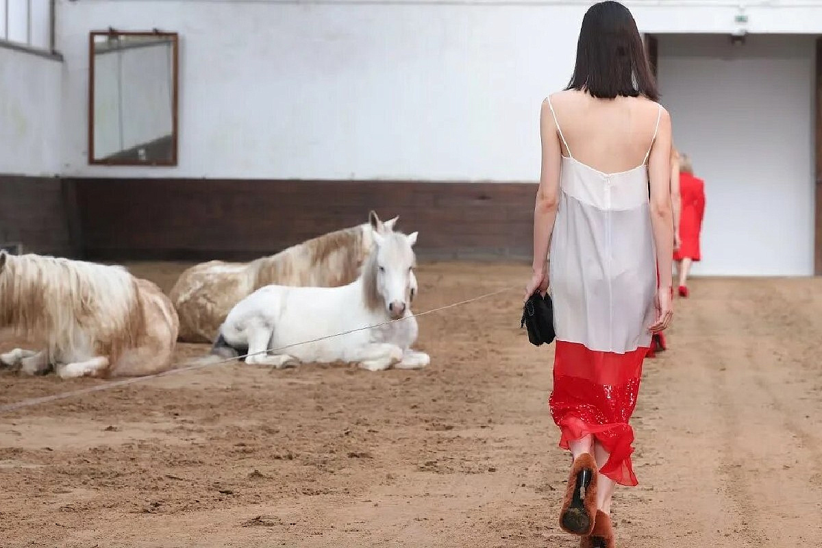 Коллекция осень-зима 2026 вдохновлена конной эстетикой. На подиуме — высокие сапоги для верховой езды, брюки и джинсы со штрипками, яркие