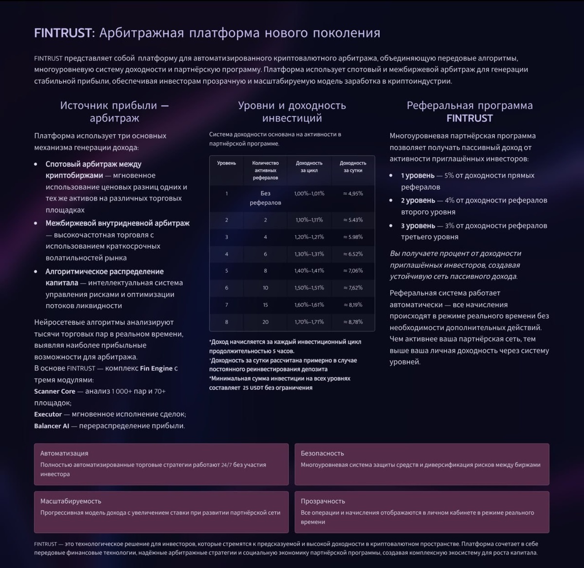 В последние месяцы в сети активно всплывает проект Fintrust Group S.A. Его рекламируют через рассылки, форумы, соцсети и Telegram-каналы. Обещания стандартные: стабильный заработок на финансовых рынках, умные алгоритмы, автоматическая торговля и якобы «инновационные стратегии». На первый взгляд всё выглядит солидно. Но при более внимательном разборе картина меняется. Если вы не хотите связываться с сомнительными инвестиционными платформами и искать деньги потом по всей сети, можно посмотреть проверенные варианты здесь. Fintrust Group S.A. позиционируется как инвестиционный сервис или брокерская платформа. Пользователям обещают доступ к торговле на финансовых рынках и участие в прибыльных стратегиях. В рекламных материалах фигурируют: • автоматические торговые алгоритмы