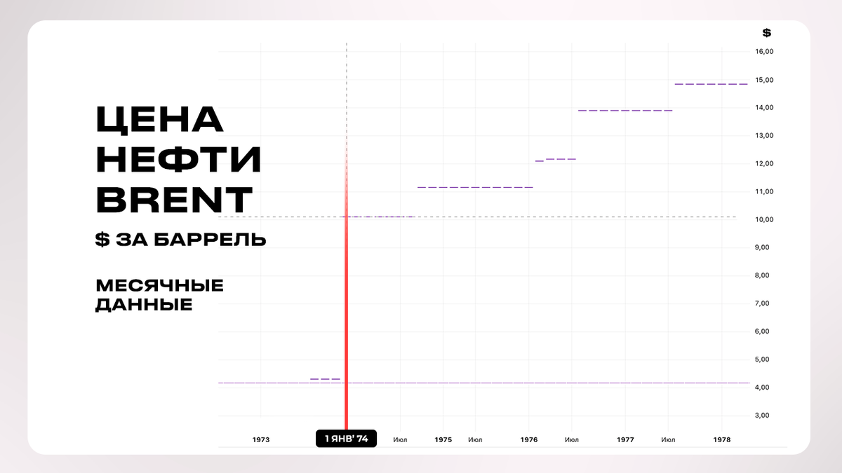 Brent, который до вторжения торговался около $17–18 за баррель, в течение нескольких месяцев поднимается к $35–40. Рост почти в два раза. Это резкий скачок — но принципиально иной по структуре, чем в 1973 и 1979 годах.
