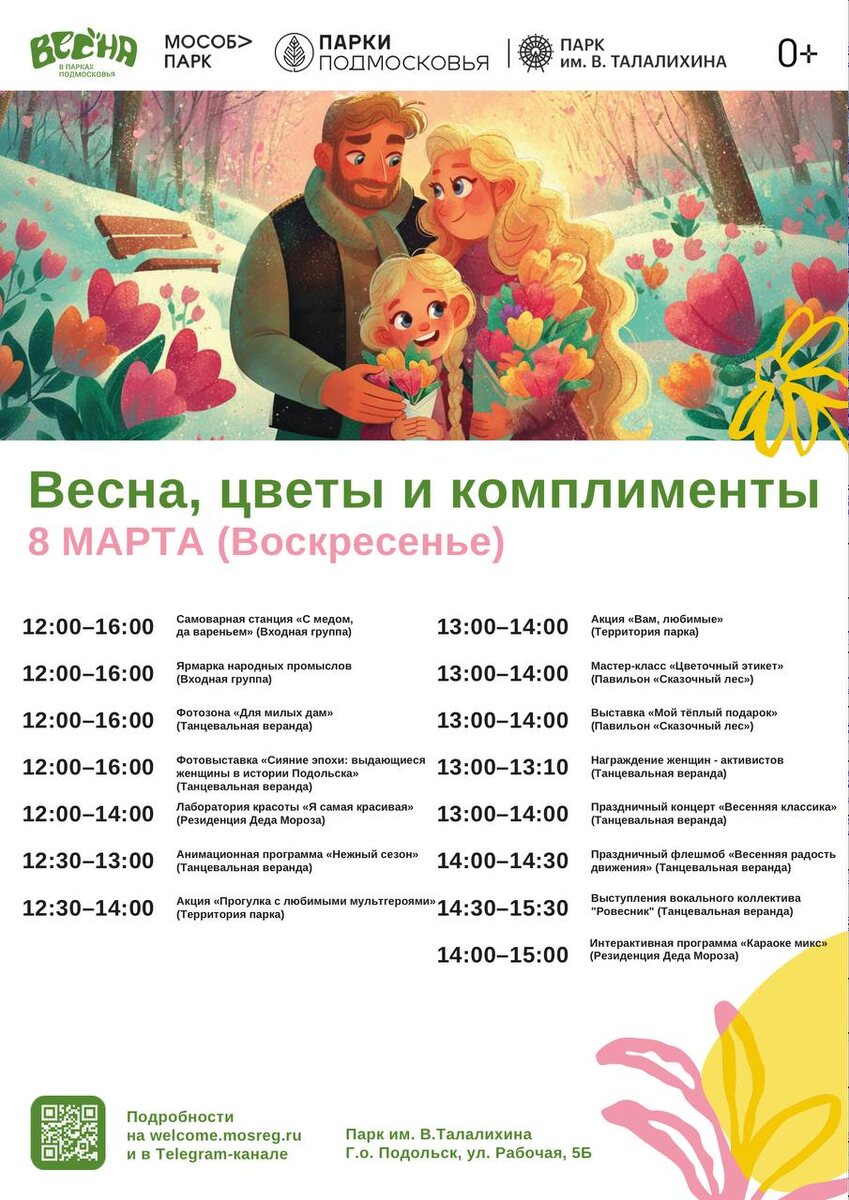 ✨ 8 марта в парке им. В. Таллалихина 🚩 12:00-16:00 Самоварная станция, ярмарка, фотозона, фотовыставка 🚩 12:00-14:00 Лаборатория красоты (Резиденция); 🚩 13:00-14:00 Акция «Вам, любимые!» На танцевальной веранде: 🚩 12:30-13:00 Анимация 🚩 13:00-14:00 Мастер-класс «Цветочный этикет» (Павильон «Сказочный лес») 🚩 13:00-13:10 Торжественное награждение женщин 🚩 13:00-15:30 Концерт, Флешмоб 🚩 14:00-15:00 «Караоке микс» (Резиденция). 🚫 Возраст: 0+ 📆 08.03.2026 🕒 12:00 🏢 Парк культуры и отдыха им. В. Талалихина 📍 г. Подольск, ул. Рабочая, 5Б 💰 Вход свободный❗️ ⭐Поддержать канал голосом 🍰Где поесть в Подольске ✅ Мероприятия Подольск https://dzen.ru/id/66ed500f7b5671493eca3fd6 https://vk.ru/podolsk_events http://dzen.ru/podolsk_events