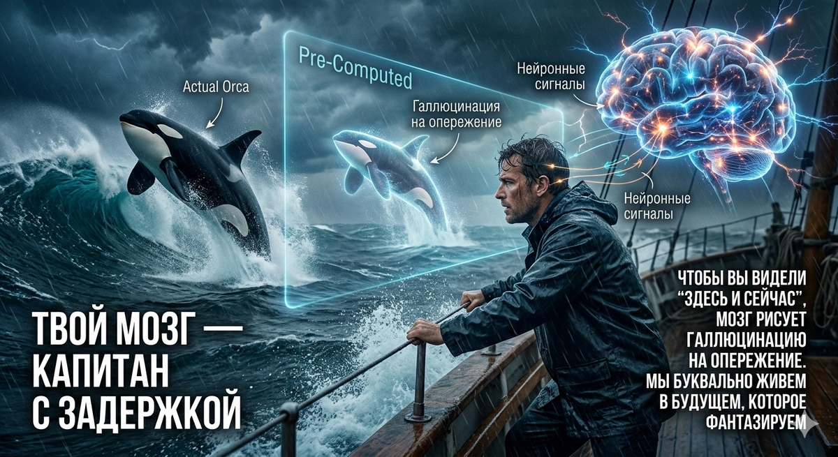 Чтобы ты видел реальность «здесь и сейчас», мозг рисует галлюцинацию на опережение. Если косатка выпрыгнет из воды, ты увидишь её там, где она должна быть по расчетам твоего внутреннего компьютера.
