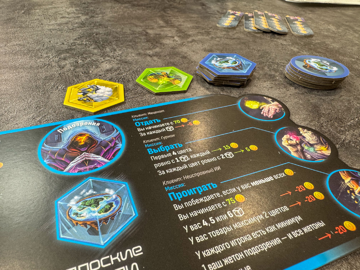 А может, вы вообще получите цель — набрать меньше всех победных очков. Самая, пожалуй, необычная цель, достичь которой не так-то просто. На старте у такого игрока 70 ПО, и в конце игры у него отнимутся очки, если у него будет 4–6 товаров, если они будут всего двух цветов и если этот игрок раскидал свои жетоны всем игрокам, но все ошибочно.