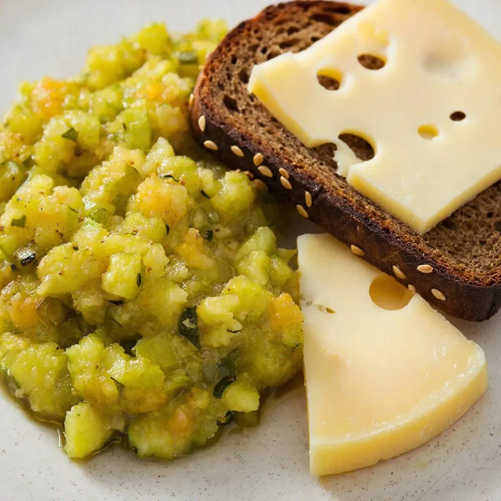 Кабачковая икра с черным хлебом и ломтиком сыра Ингредиенты: Способ приготовления: Рекомендации при готовке: Чем полезно это блюдо: