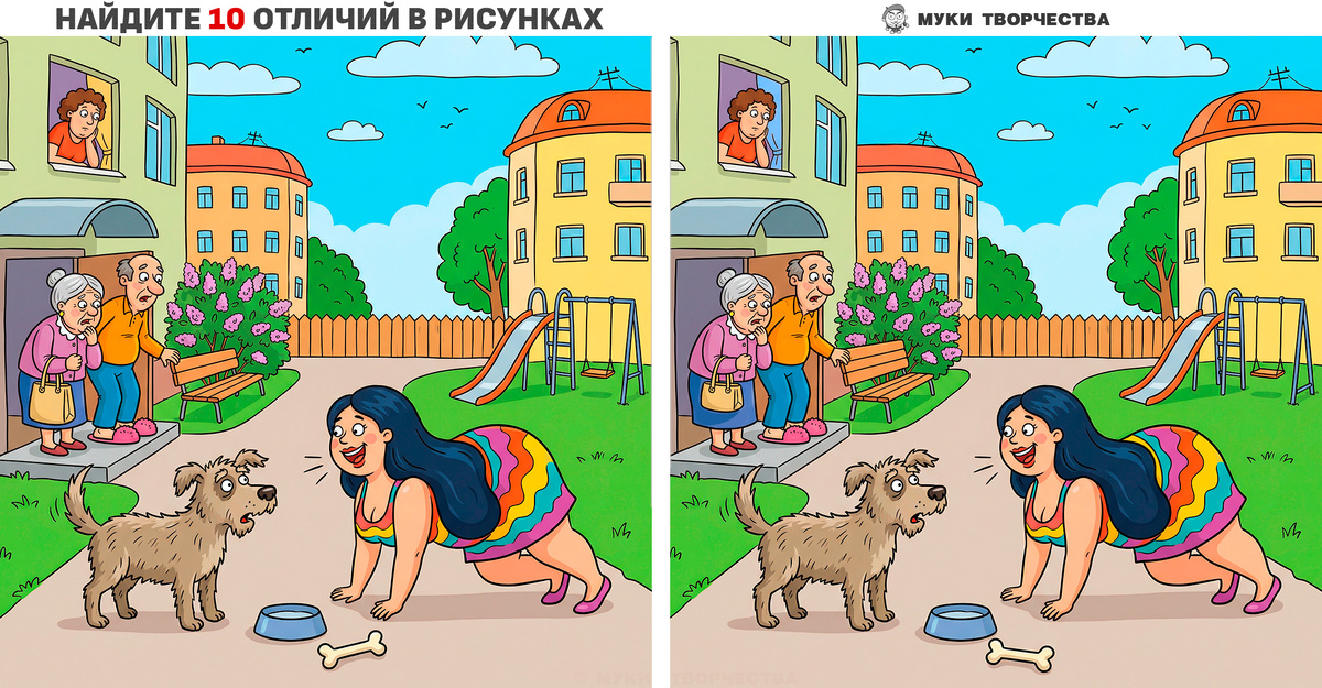 Найдите 10-ть отличий на двух похожих рисунках с забавным сюжетом из спального района Москвы. Где пышная женщина удивила собаку, а заодно и всех соседей. Чего только не увидишь в 2026 году!