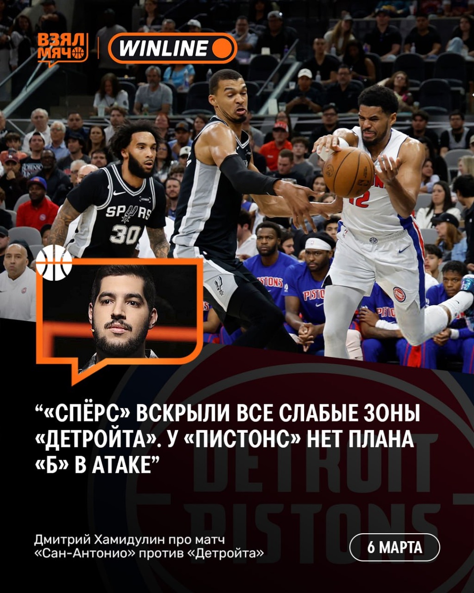 »? Сегодня «Спёрс» уверенно разобрались с «Пистонс» — 121:106. Команда Виктора Вембаньямы не просто выиграла матч, а по ходу встречи техасцы вскрыли несколько системных проблем «Детройта». Митя Хамидулин объяснил, что именно произошло ⬇️ 🗣 «Если честно, я давно не оставался под таким впечатлением от команды, как сегодня. „Спёрс“ не просто переиграли „Пистонс“, они вскрыли вообще все слабые зоны этого „Детройта“. Начнём с Дюрена. „Сан-Антонио“, а конкретно Вембаньяма собственноручно посадил его на скамейку. Столь круто проводящий сезон Джейлен сегодня смотрелся просто, как мальчик для битья. Элементарные ошибки, фолы просто сделали его минусовой фигурой на паркете. И здесь важно подчеркнуть: это были ровно те же ошибки, что были у него раньше. Необдуманные контакты с атакующими игроками, плохой выбор позиции и, как следствие, ранние фолы. Для сравнения: первый фол Стюарта, который заменил Дюрена, случился в четвертой четверти. Конечно, сильно повлияло отсутствие Осара Томпсона. К