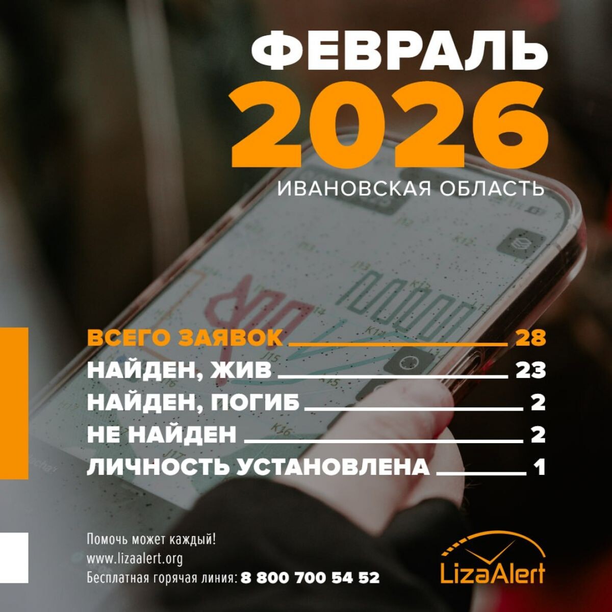 В феврале в поисково-спасательный отряд «ЛизаАлерт» поступило 28 заявок о пропавших жителях Ивановской области. По данным объединения, 23 человека были найдены живыми. К сожалению, в двух случаях пропавших обнаружили погибшими. Еще два человека пока остаются ненайденными. В одном случае удалось установить личность. Февраль стал непростым месяцем для поискового отряда, отмечают спасатели. Снегопады и метели усложняли работу, но добровольцы продолжали искать людей, которые потеряли дорогу домой.