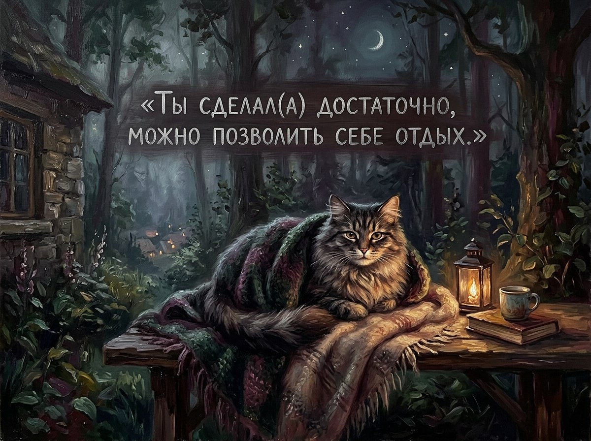 Всё, что получилось, и всё, что не сложилось, сегодня находит своё место, как звёзды находят свои созвездия. Ты сделал(а) достаточно, можно позволить себе отдых. Послушай, как ночь дышит ровно и спокойно. Так же спокойно может биться и твоё сердце, зная: в тебе уже есть всё необходимое для завтрашних шагов. Пусть сон придёт, как тихий лесной туман, принесёт тебе исцеление, новые силы и ясные ответы. Я, кот, сторожу этот покой и мягко мурлычу миру, чтобы он был особенно добр к тебе этой ночью.