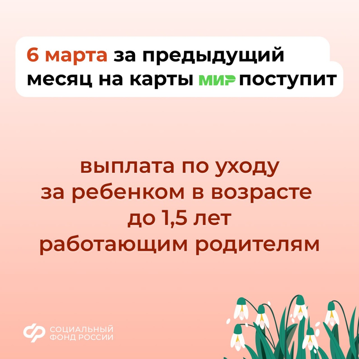 6 марта трудоустроенные родители из исторических регионов России получат выплаты на детей в возрасте до 1,5 лет. СФР выплачивает ежемесячное пособие по уходу за ребенком работающим гражданам, оформившим отпуск по уходу за ребенком в возрасте до 3 лет. Пособие выплачивается до достижения ребенком 1,5 лет. ————— Поддержите канал Подпиской на "Сыны Отечества" или Голосом за канал ✅ подписаться |⚡️проголосовать 📲Наш проект в социальных сетях: Вконтакте, Одноклассники, Дзен, RuTube Теперь мы и в МАХ!